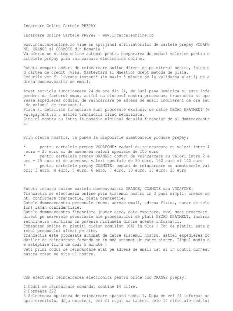 Cartela De Reincarcare Prepay 5euro Accesorii Orange Romania Source from : https://www.orange.ro/magazin-online/accesorii/accesorii-/cartela-de-reincarcare-prepay-5-euro Cod reincarcare cartela orange prepay 5 euro. Plata prin paypal sau card bancar. Bonusul de reîncărcare și perioada de valabilitate se acordă doar la. Aici poti publica orice legat de vanzari/cumparari (inclusiv dispunerea unui calculator ca server). Valoare minima cod de reincarcare: