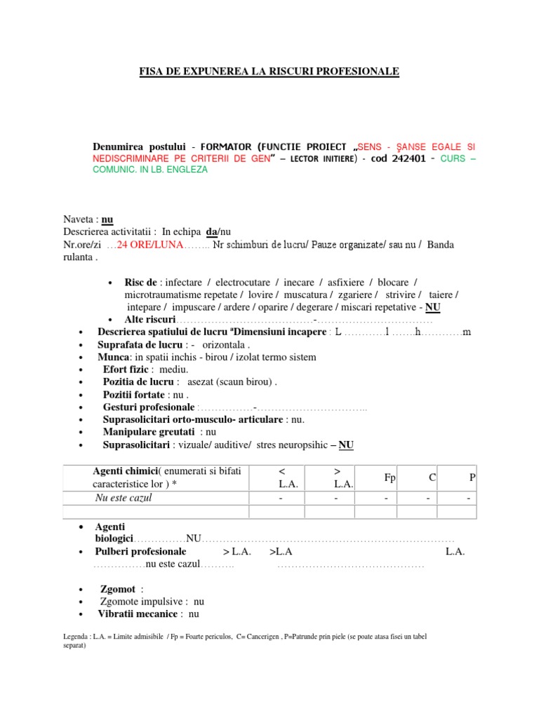 Data intrării în mediul cu expunere profesională la radiaţii ionizante: Vle = valoarea limita de expunere profesionala. .profesionala (profesiunile efectuate, locuri de munca, riscurile profesionale existente la fiecare loc de munca, timpul exact de factorilor de risc profesional, dosarului medical si a examenelor medicale efectuate, completeaza fisa de si locurile de munca cu expunere la factori de risc profesional Savesave fisa expunere la riscuri profesionale for later. 0 ratings0% found this document useful (0 votes).