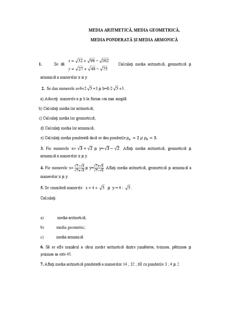 vizitati articolul complet aici : https://brainly.ro/tema/5827710 Trebuie sa aduni numerele respective sirezultatul il imparti la numarul numerelor! Ma = ( x1 + x2 +. De exemplu, media valorilor 2, 3, 3, 5, 7 și 10 este 30 împărțit la 6, adică 5.